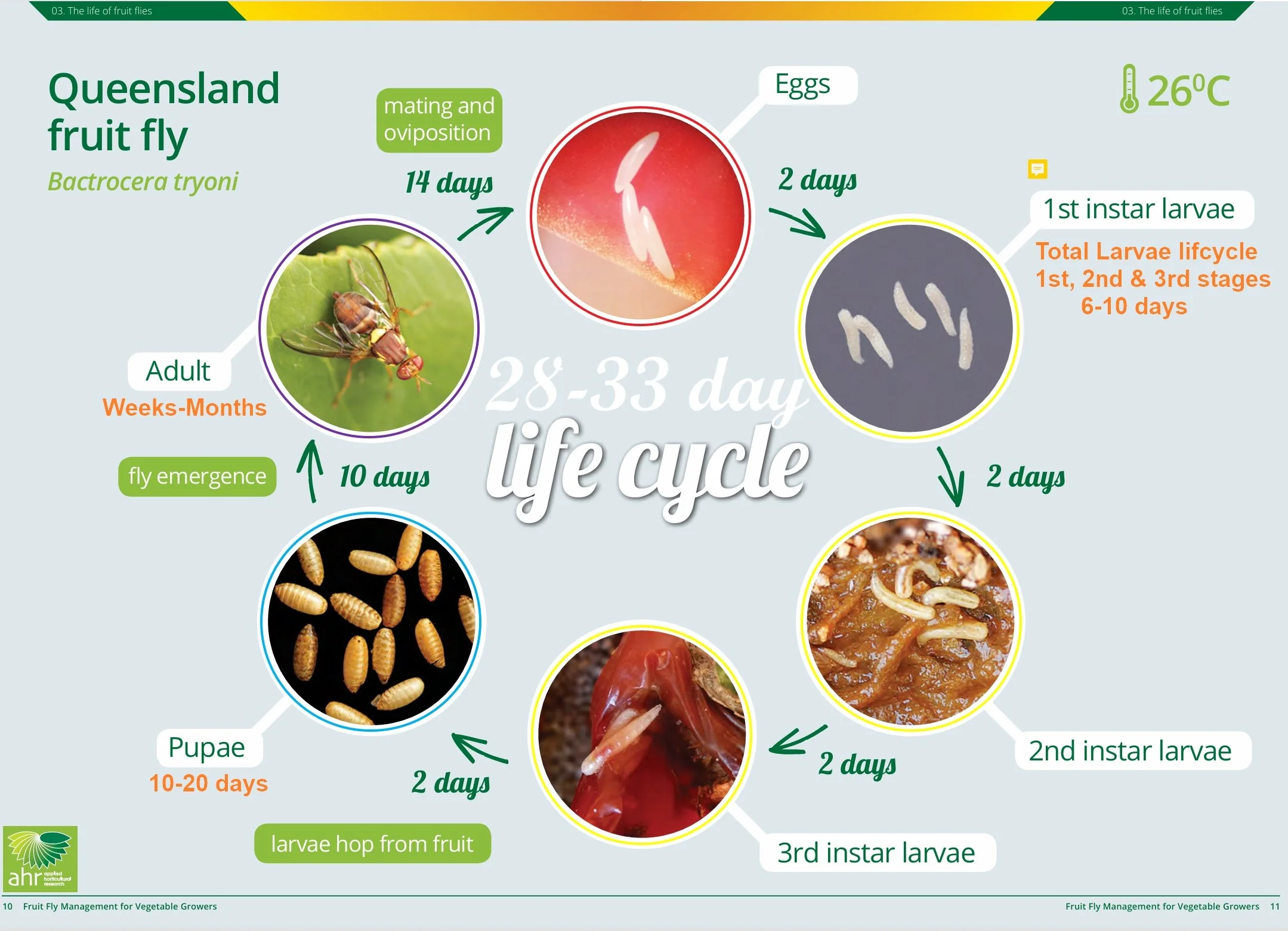 A Queensland fruit fly (QFF) life cycle takes about 4 weeks in favourable conditions (warm temperatures and high rainfall and humidity), but longer in cool, dry weather (Figure 2). The adult population reduces in winter, with some inactive adults surviving by sheltering (over-wintering) in protected areas.