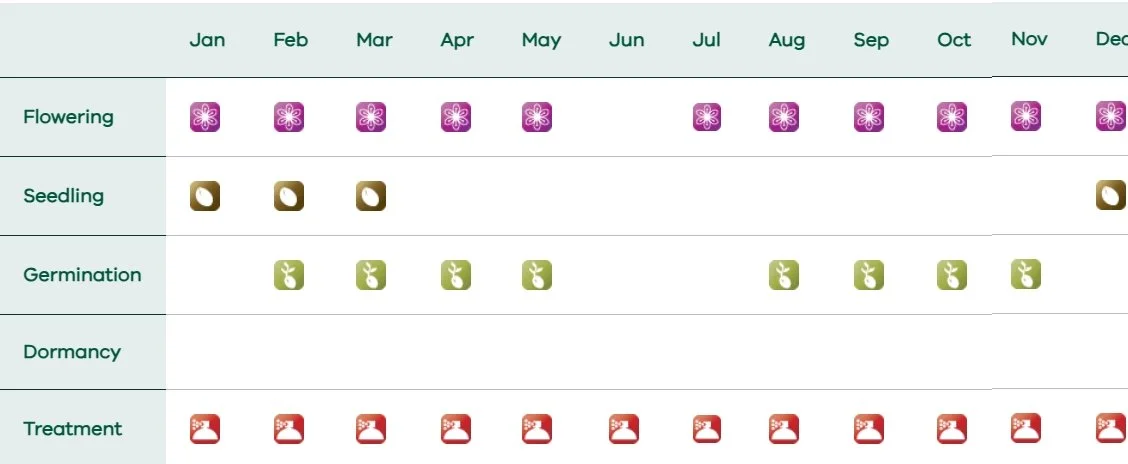 Germination mainly occurs in autumn and spring, seedlings can flower at about 18 months old, plants can live several decades, and flowering and seeding often occur in two main periods (spring and autumn) with some year‑round flowering in mild climates.